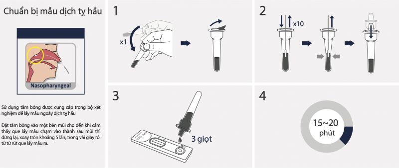 1. Sử dụng tăm bông được cung cấp trong bộ xét nghiệm để lấy mẫu ngoáy dịch tỵ hầu.