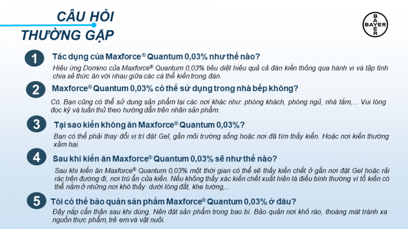• Maxforce Quantum là loại chế phẩm diệt kiến dạng gel có chất dẫn dụ đặc biệt với liều dùng cực thấp 1 giọt/ m2.